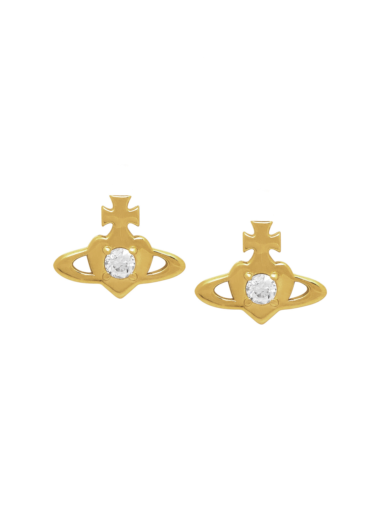 Noella earrings feature a highly polished all-metal heart orb silhouette, recalling Vivienne's affection for humanity and the planet. Adorned with a large, glistening white crystal, the piece is finished in recycled silver with a gold-tone plating.